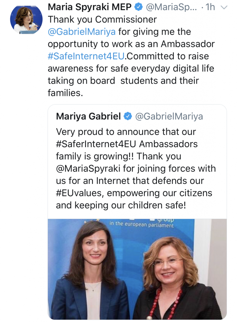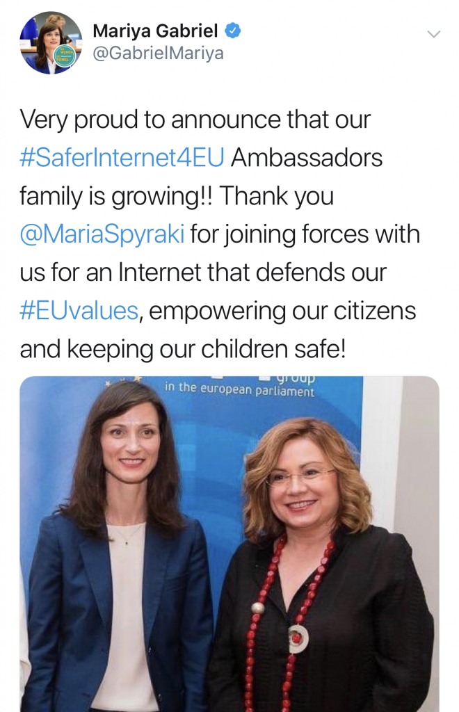 Η κ. Γκάμπριελ ανήρτησε μία φωτογραφία σημειώνοντας τα εξής: «Είμαι στην ευχάριστη θέση να ανακοινώνω πως η οικογένεια των Πρέσβεων για ασφαλές διαδίκτυο στην Ευρώπη μεγαλώνει. Ευχαριστώ τη Μαρία Σπυράκη που συμμετέχει στην προσπάθεια μας για ένα διαδίκτυο που θα υπερασπίζεται τις ευρωπαϊκές αξίες, θα ενδυναμώνει τους πολίτες και θα φροντίζει για την ασφάλεια των παιδιών μας».