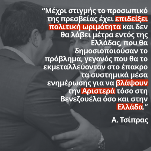 Ειδικά, ο κ. Τσίπρας στην επιστολή του προς τον κ. Μαδούρο αναφέρει: «…Μέχρι στιγμής το προσωπικό της πρεσβείας έχει επιδείξει πολιτική ωριμότητα και δεν θα λάβει μέτρα εντός της Ελλάδας, που θα δημοσιοποιούσαν το πρόβλημα, γεγονός που θα το εκμεταλλεύονταν στο έπακρο τα συστημικά μέσα ενημέρωσης για να βλάψουν την Αριστερά τόσο στη Βενεζουέλα όσο και στην Ελλάδα»